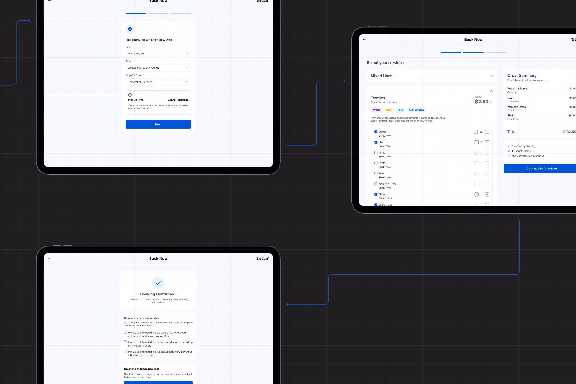 From choosing your pickup time to handing over your clothes, the entire journey is designed to feel effortless. The step-by-step flow shows how customers schedule, add items, and relax while everything is handled. It captures the ease and convenience of a service built to remove the weight of everyday chores.